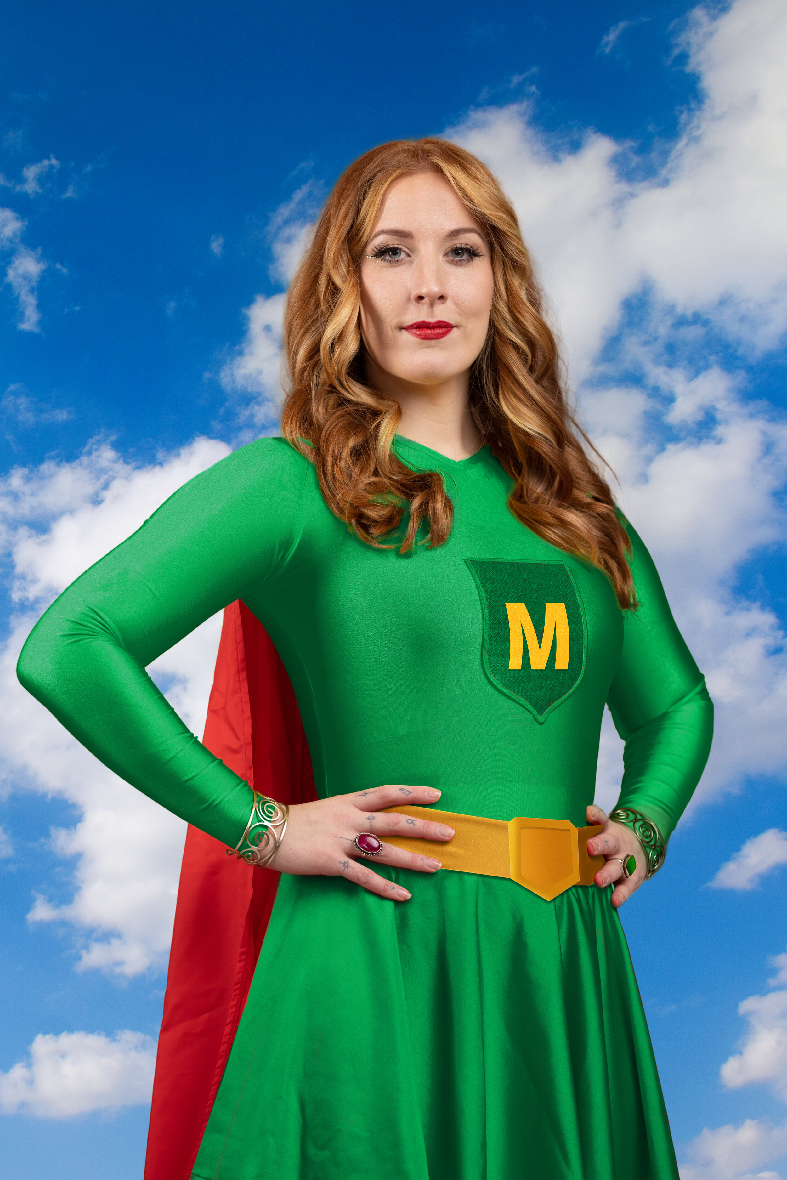 Donning her green MonuMint uniform, symbolizing life and renewal, and a flowing rose-pink cape for compassion, she took on the mission of restoring monuments and reigniting remembrance. The “M” on her chest stands not just for MonuMint—but for Memory, Meaning, and Mending the past.
